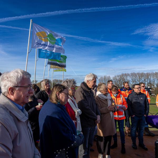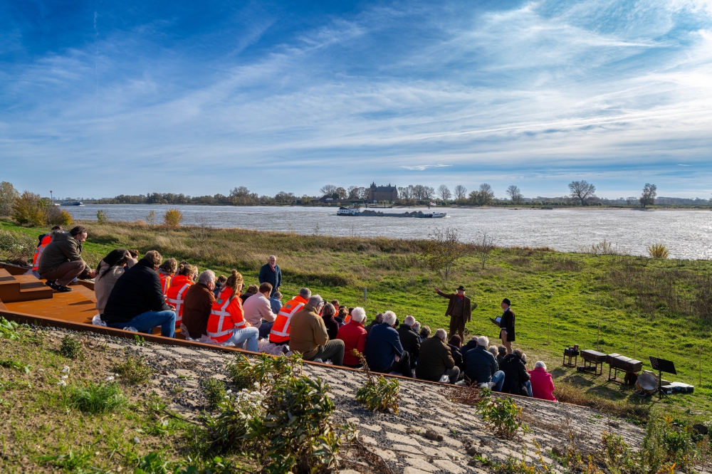 De dijkversterking tussen Gorinchem en Waardenburg is bijna klaar. Op weg naar het echte ‘hoogwaterveiligmoment’ op 1 december was er aandacht voor bijzondere locaties langs de dijk. Op woensdagmiddag 12 november stonden we met bestuurders en bewoners op de Herculespost bij Dalem. Verhalenvertellers brachten het verleden tot leven met verhaal en muziek. En er was aandacht voor de maquette die laat zien hoe de verdediging in dit gebied vroeger verliep.