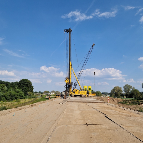 Deze damwand bestaat uit buispalen en damwandplanken die elkaar afwisselen. Eerst boren we de buispalen in de grond en vervolgens plaatsen we daar de damwandplanken tussen. We hebben al 8 buispalen aangebracht. Vanaf volgende week starten we ook met het aanbrengen van de damwandplanken. Dit kan iets meer geluid veroorzaken dan het aanbrengen van de buispalen. Voorlopig verlopen de werkzaamheden voorspoedig.