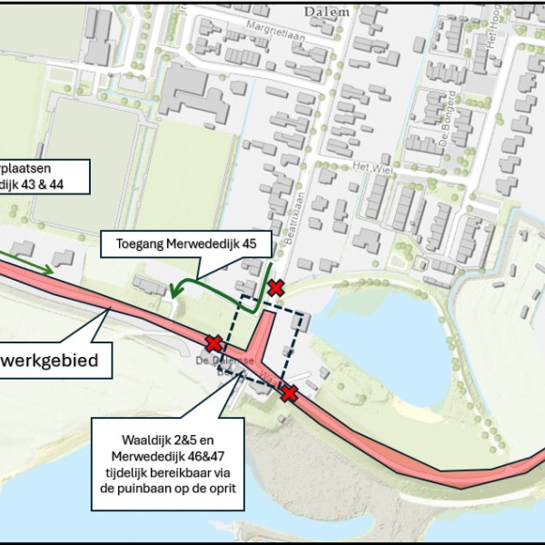 - Merwededijk 46-47 en Waaldijk 2-5 zijn de eerste weken nog bereikbaar via de dijkopgang. Dit is alleen voor de bewoners van deze adressen en hun bezoekers. De weg links en rechts van de dijkopgang is dicht. Als we de dijkopgang gaan vernieuwen zijn deze adressen bereikbaar via de Dalemse Sluis.